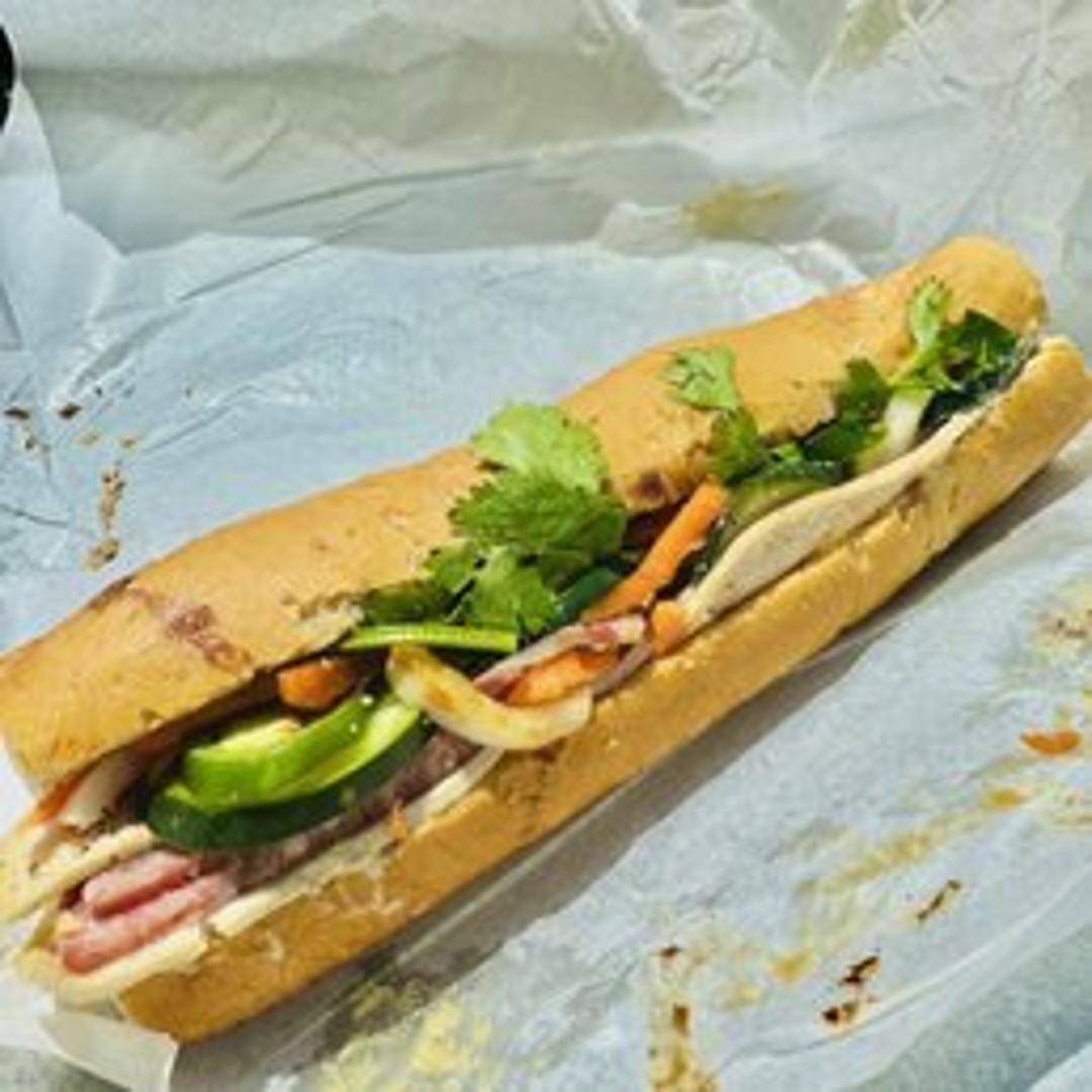 A classic Banh Mi featuring a crusty baguette filled with an assortment of Vietnamese cold cuts, typically including ham, head cheese, and pork roll. Garnished with pickled daikon and carrots, fresh cilantro, sliced cucumbers, jalapeños (optional), and a smear of pâté and mayonnaise.