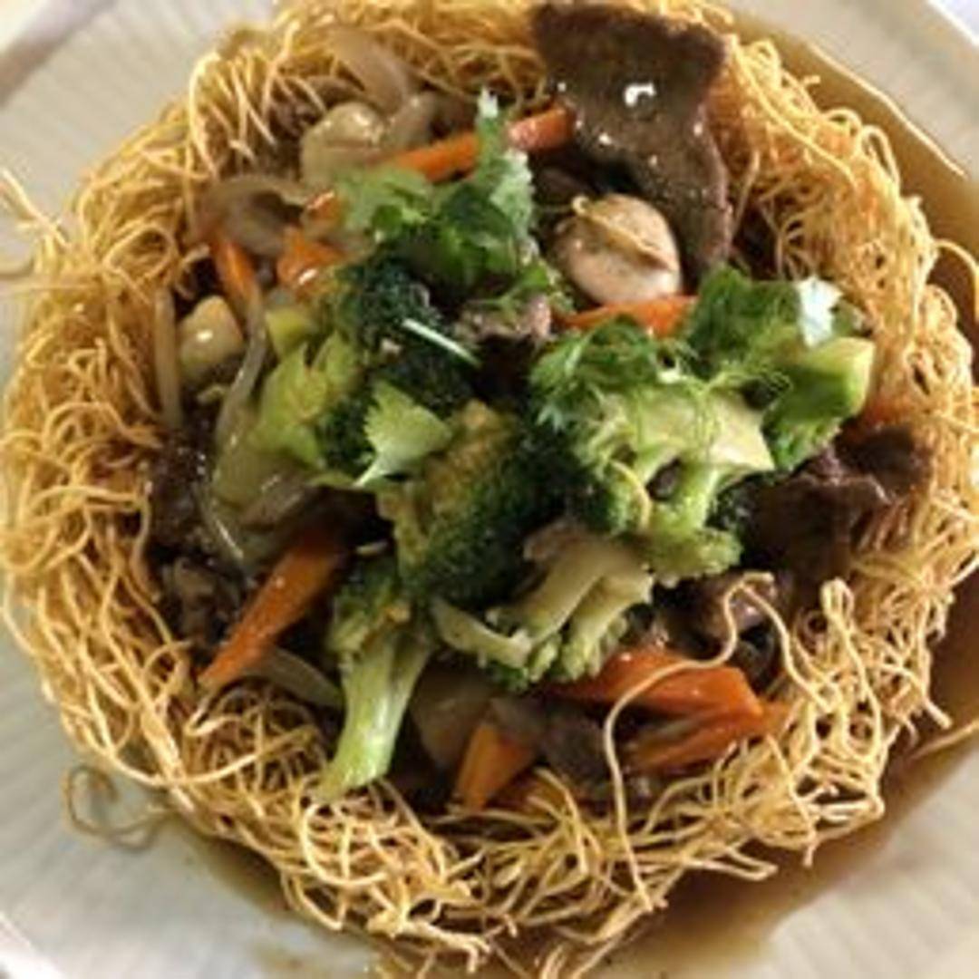 A traditional Thai appetizer featuring delicate, crispy rice vermicelli noodles coated in a complex sweet and sour sauce made from tamarind, palm sugar, and lime. This dish often includes small pieces of shrimp, tofu, or thinly sliced egg, garnished with fresh bean sprouts and cilantro, creating a unique textural and flavor journey.