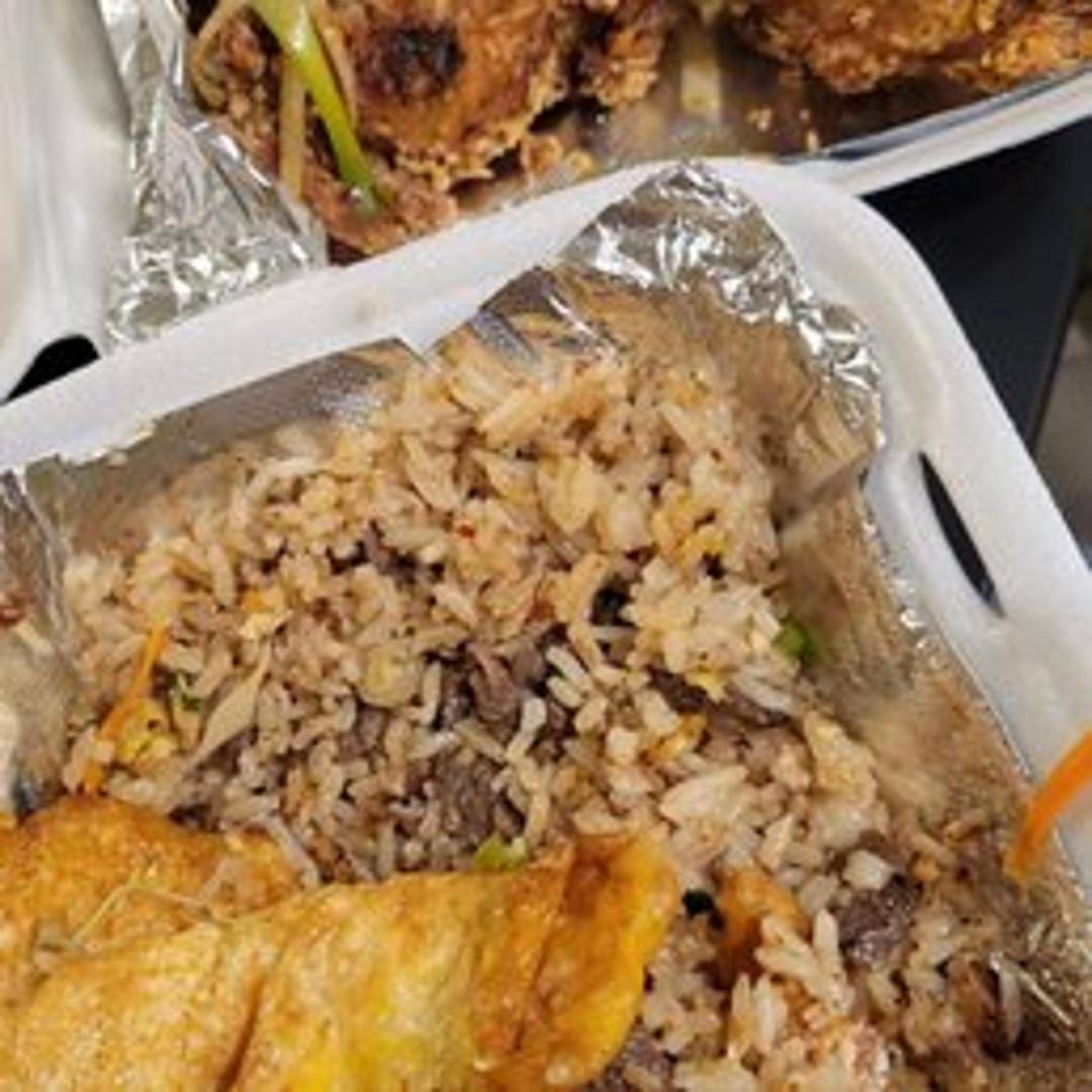 A traditional Lao-style fried rice, distinguished by its rich, savory flavor profile. Wok-fried jasmine rice with your choice of protein, onions, carrots, and green peas, seasoned with authentic Lao sauces and spices for a unique depth of umami. A hearty and aromatic main course.