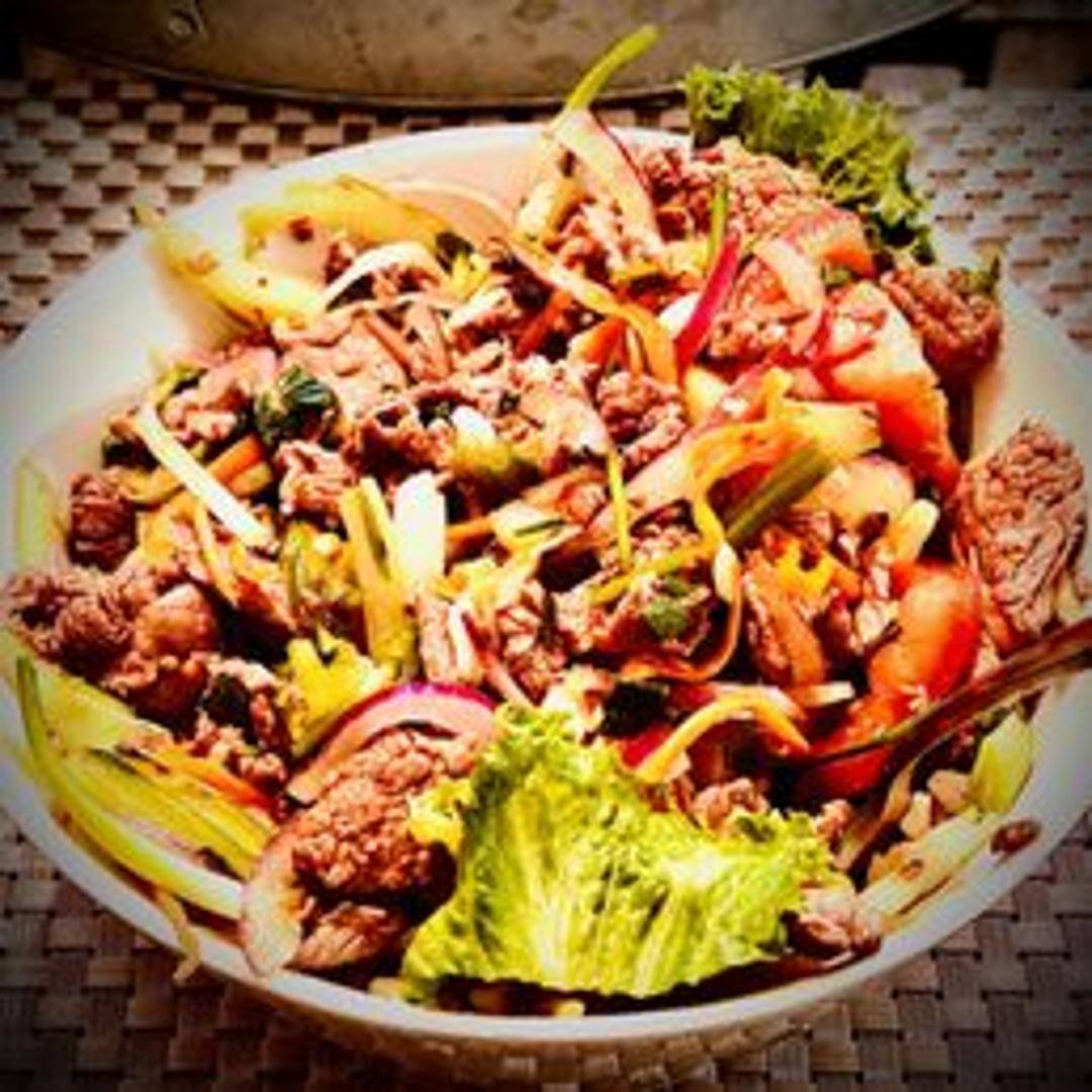 Refresh your palate with the vibrant Thai Beef Salad, a zesty and invigorating dish featuring thinly sliced, perfectly grilled beef tossed with crisp vegetables such as cucumbers, tomatoes, and onions. This delightful salad is dressed in a tantalizing lime-based vinaigrette, infused with fish sauce, chilies, and fresh herbs like mint and cilantro, creating a harmonious balance of savory, sour, spicy, and herbaceous notes.