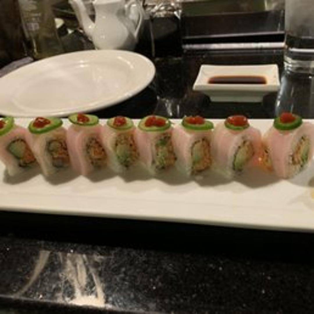 Thinly sliced seared tuna on top of thinly sliced cucumber and avocado, topped with ponzu sauce and fried garlic.