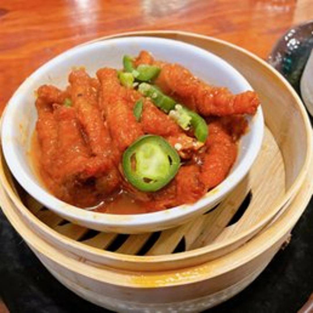 Steamed and then deep-fried chicken feet, braised in a savory black bean sauce. The skin is tender and gelatinous, with a rich, umami flavor and a hint of spice. A classic dim sum delicacy.
