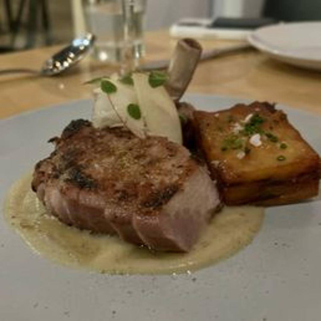 Seared pork chop, expertly seasoned and cooked to perfection. Served with seasonal accompaniments, highlighting fresh, complementary flavors.