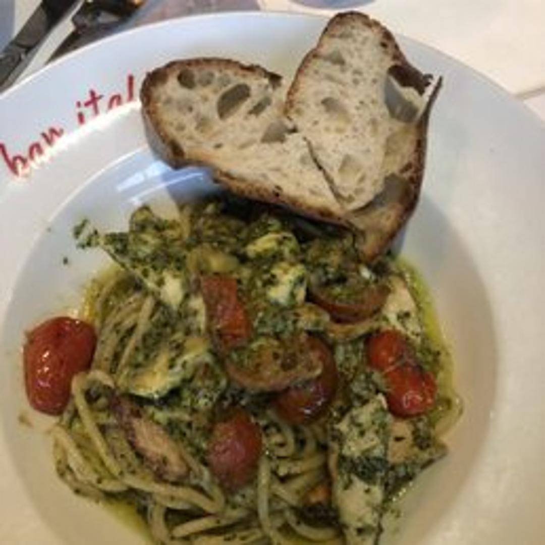 Al dente bucatini pasta, known for its hollow center, is generously tossed in our vibrant homemade pesto sauce. Crafted with fresh basil, fragrant garlic, toasted pine nuts, premium Pecorino Romano cheese, and extra virgin olive oil, this dish delivers a burst of classic Italian flavor.