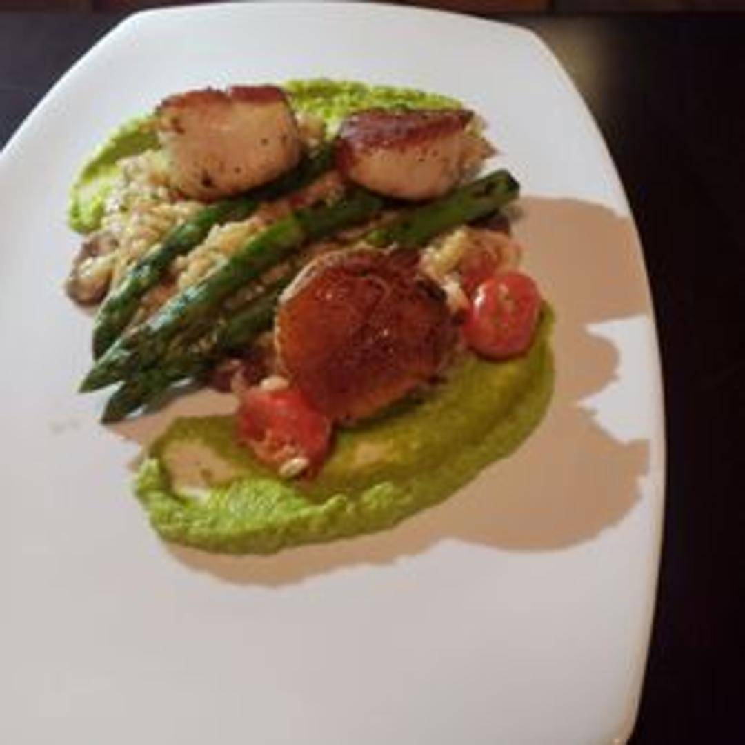 Perfectly pan-seared large sea scallops, boasting a beautiful golden-brown crust and a sweet, translucent interior. Renowned for their delicate texture and naturally sweet flavor, these oceanic gems are often presented with complementary sauces or fresh seasonal accompaniments that enhance their inherent elegance.