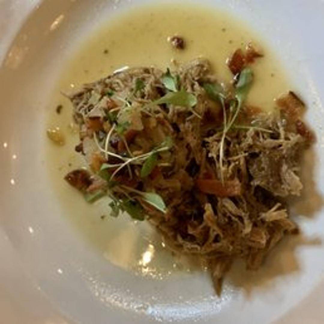 Succulent pork shoulder, slow-roasted for hours until incredibly tender and falling apart with a fork. Served with a rich, savory jus, often accompanied by seasonal root vegetables and a creamy potato puree, offering a hearty yet refined dish showcasing classic flavors.