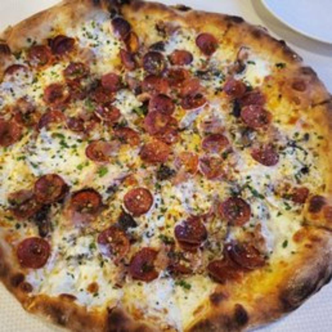 A hearty pizza featuring a blend of cheeses, pepperoni, sausage, mushrooms, onions, and green peppers.