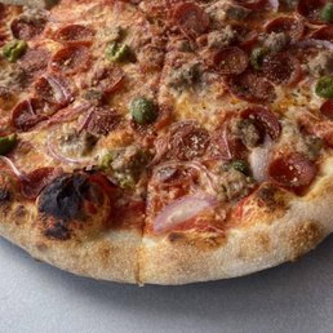 A flavor-packed pizza loaded with our signature tomato sauce and a generous blend of melted mozzarella and provolone cheeses, plus pepperoni, sausage, green peppers, red onion and black olives. A hearty and satisfying supreme experience.