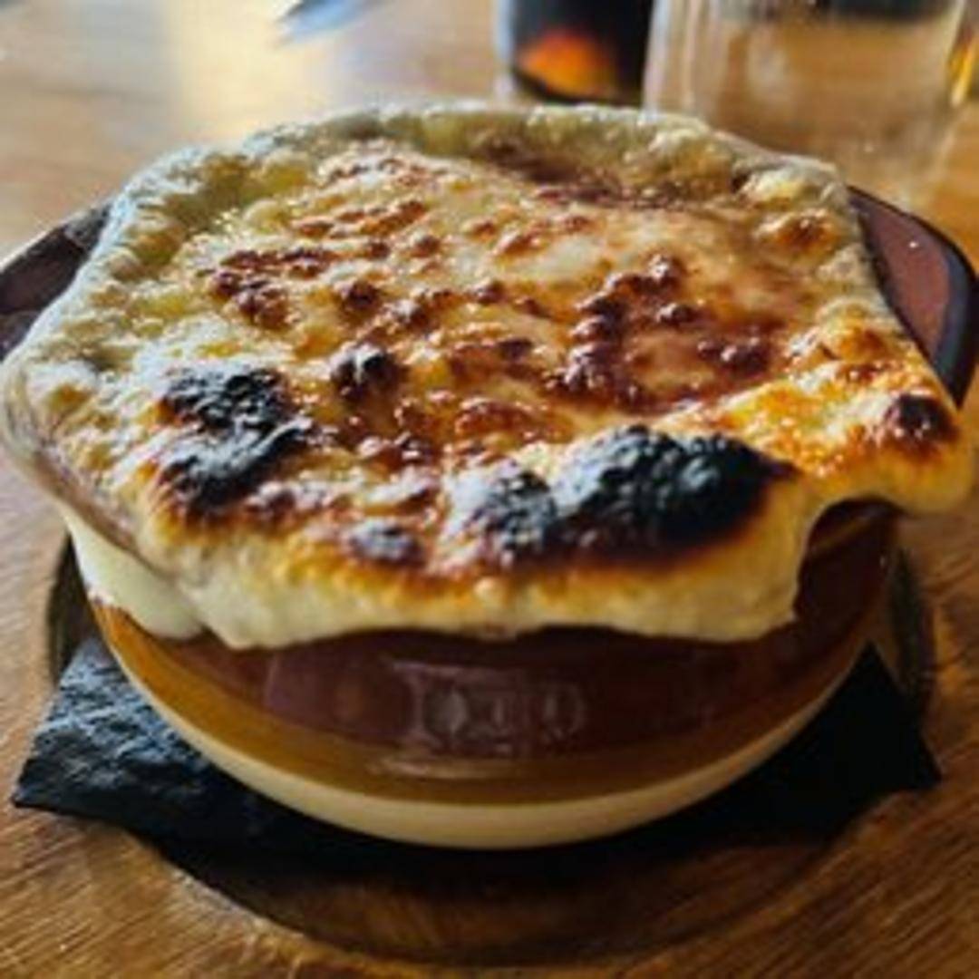 A comforting classic, our French Onion Soup features deeply caramelized sweet onions simmered in a rich, savory beef broth, slow-cooked to perfection. Crowned with a toasted baguette slice and generously melted, bubbling Gruyère cheese for a hearty, flavorful experience.