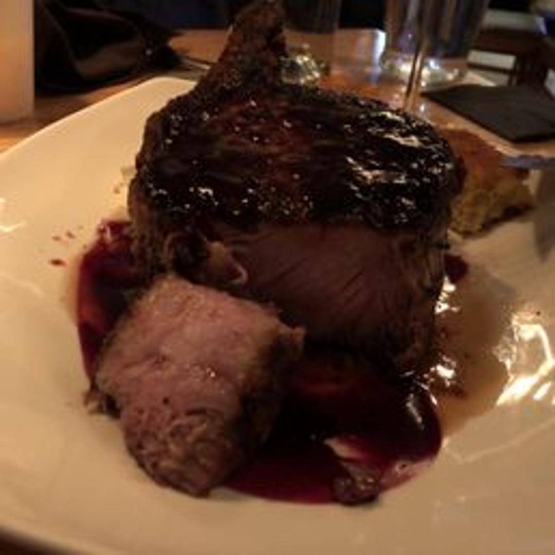 Indulge in a generously thick-cut pork chop, expertly grilled to perfection, boasting a tender interior and a beautifully seared exterior. This savory dish is often accompanied by seasonal vegetables and a complementary sauce, offering a hearty and satisfying dining experience at Barley Mac.