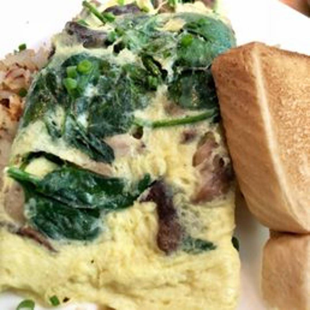 Start your day with our fluffy Spinach and Mushroom Omelette, prepared with farm-fresh eggs and generously filled with sautéed spinach, earthy mushrooms, and a delicate blend of Monterey Jack and Swiss cheeses. Served with your choice of crispy home fries or a fresh side salad.
