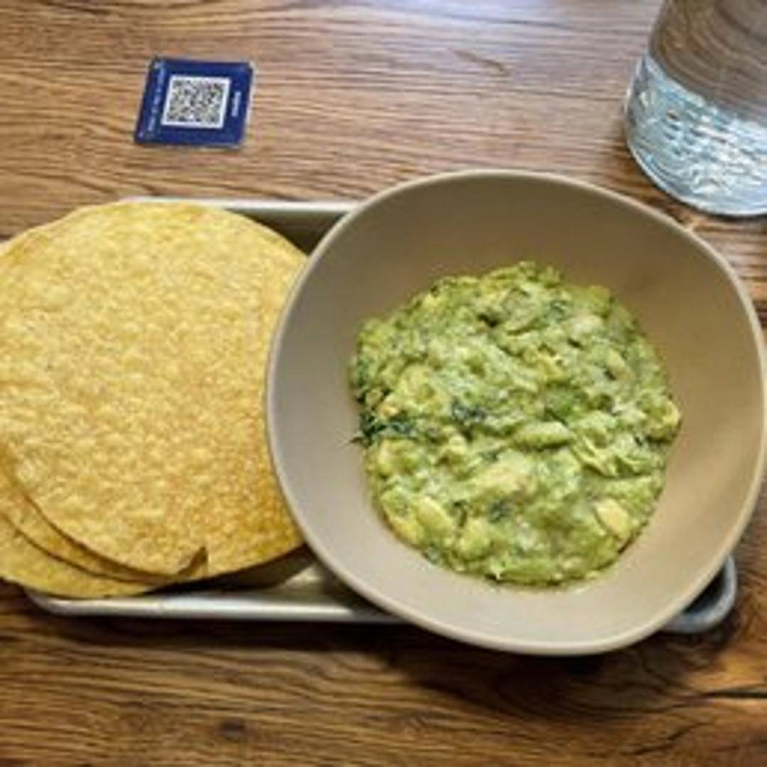 Creamy, freshly mashed guacamole made from ripe avocados, blended with cilantro, diced red onion, jalapeño, and a squeeze of lime juice, served alongside a generous portion of crisp, salted tortilla chips.
