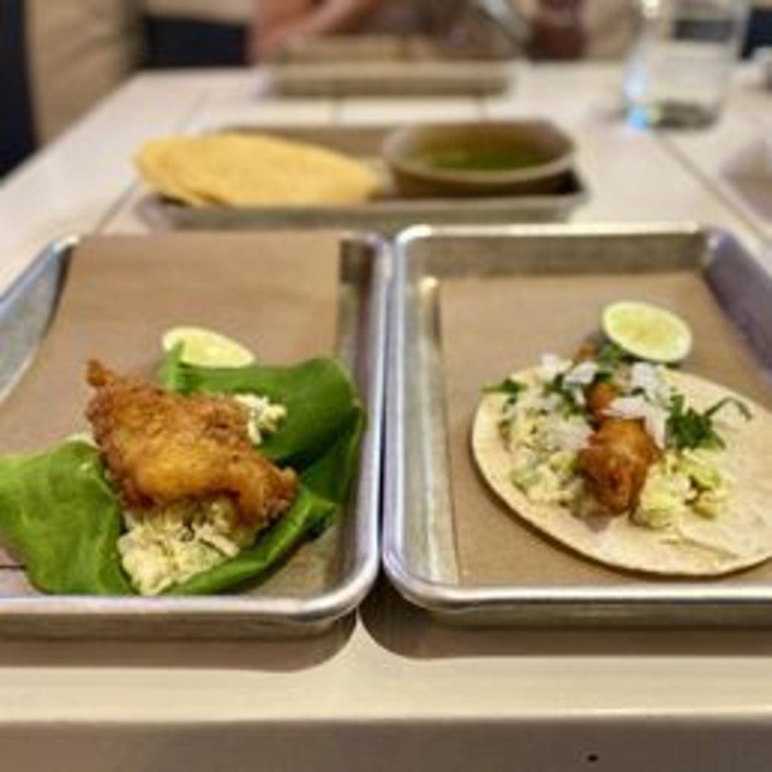 A classic take on the iconic Baja-style fish taco, featuring crispy, perfectly fried white fish that is light and flaky on the inside. This beloved taco is typically served with a fresh, crisp cabbage slaw, a drizzle of creamy, tangy sauce, and a squeeze of lime, all wrapped in a warm tortilla, offering a refreshing and authentic taste of the coast.