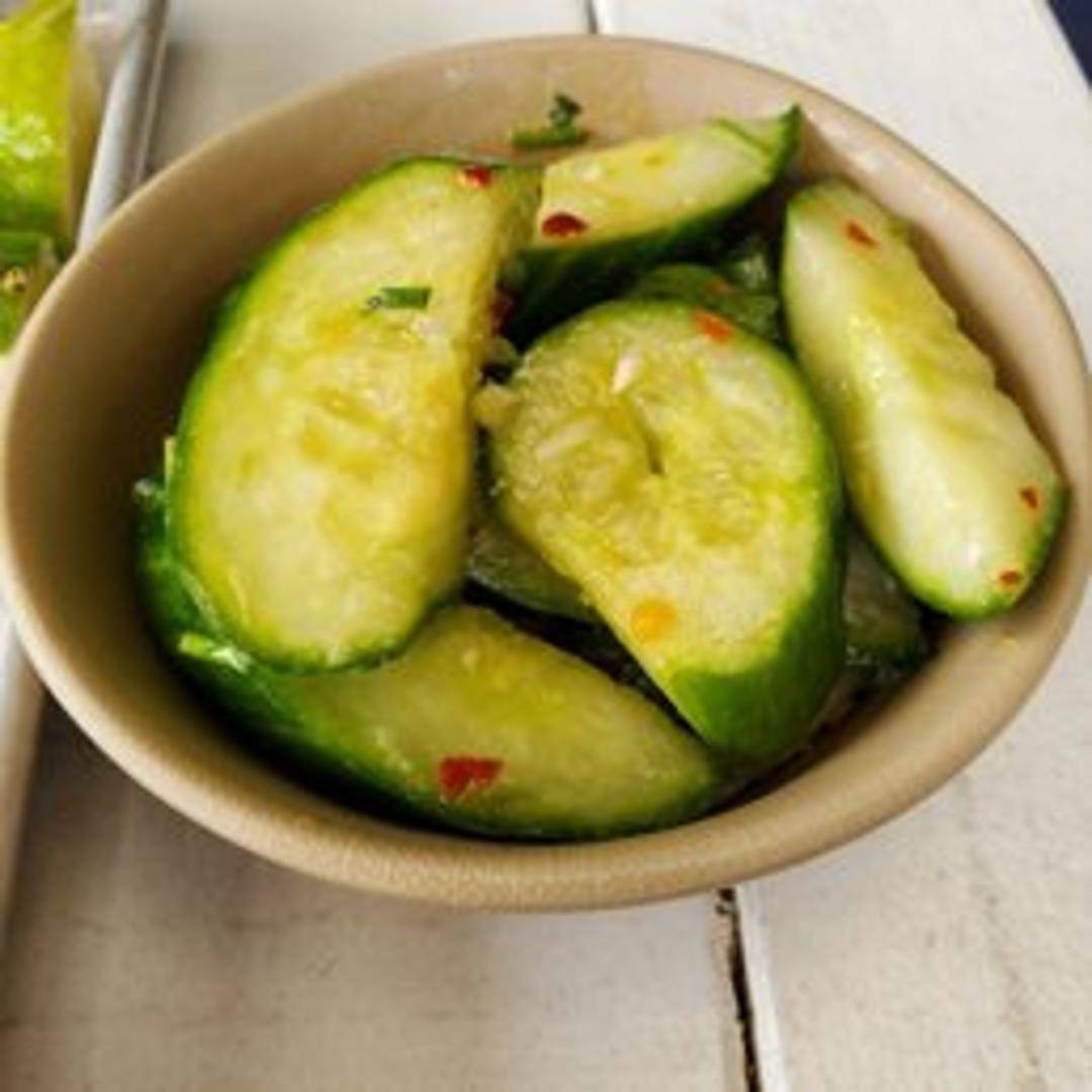 Refreshing and crisp cucumber salad with a spicy kick. Features sliced cucumbers tossed in a vibrant chili-lime dressing. Garnished with fresh herbs and spices for a balanced flavor profile.