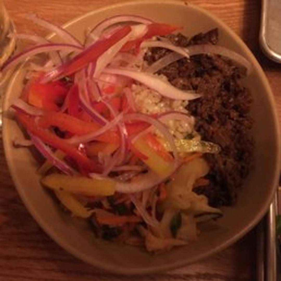 A base of fluffy rice topped with your choice of protein (e.g., chicken, steak, shrimp, or vegetables), flavorful sauces, and fresh toppings such as pico de gallo, black beans, corn, and cilantro.