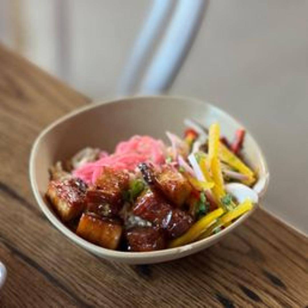 Slow-cooked pork belly, rice, black beans, pickled onions, and salsa verde.