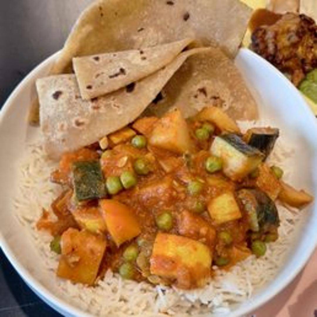A medley of fresh seasonal vegetables cooked in a flavorful curry sauce, seasoned with aromatic spices.