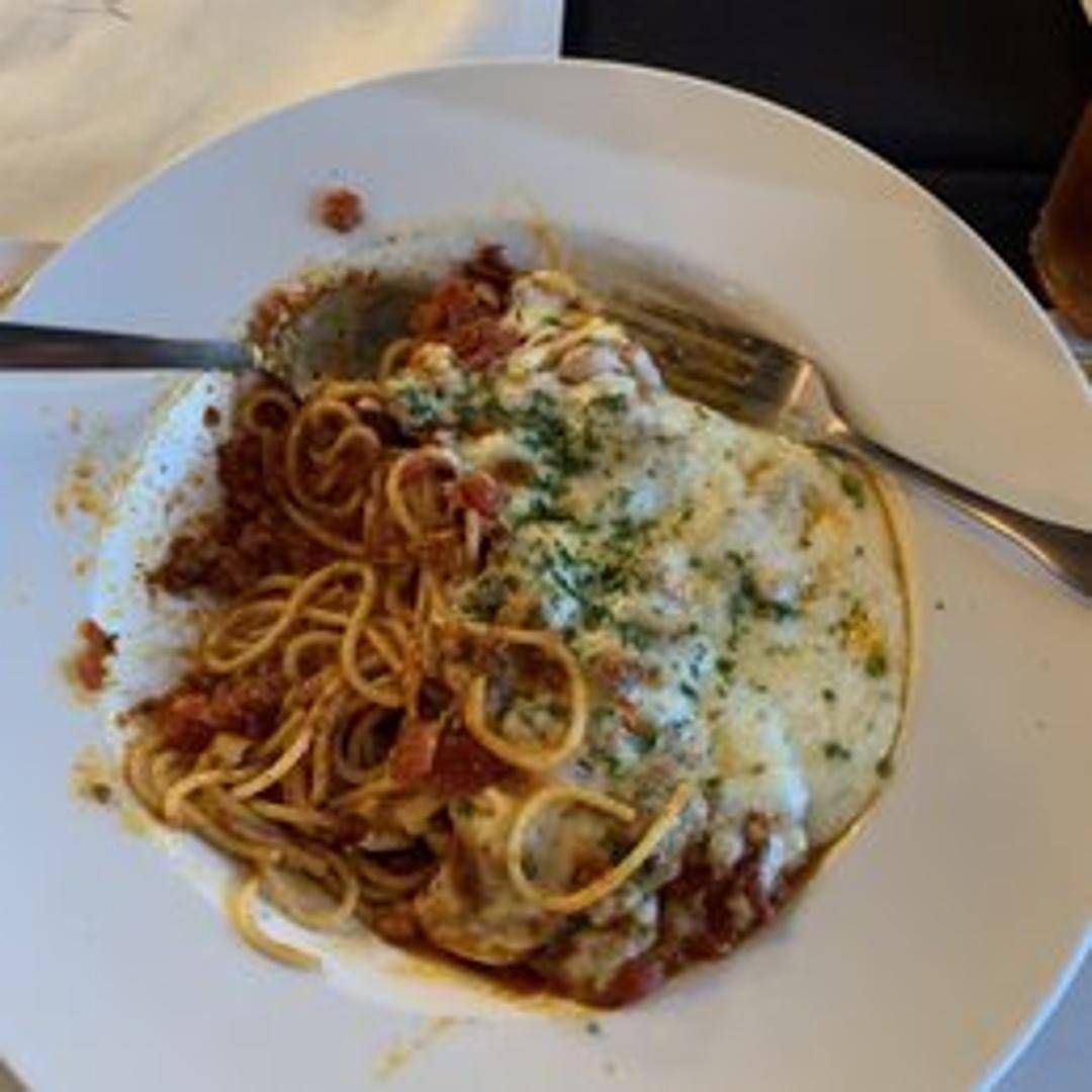 Spaghetti baked in a rich tomato sauce and topped with melted mozzarella cheese. Served hot and bubbly.