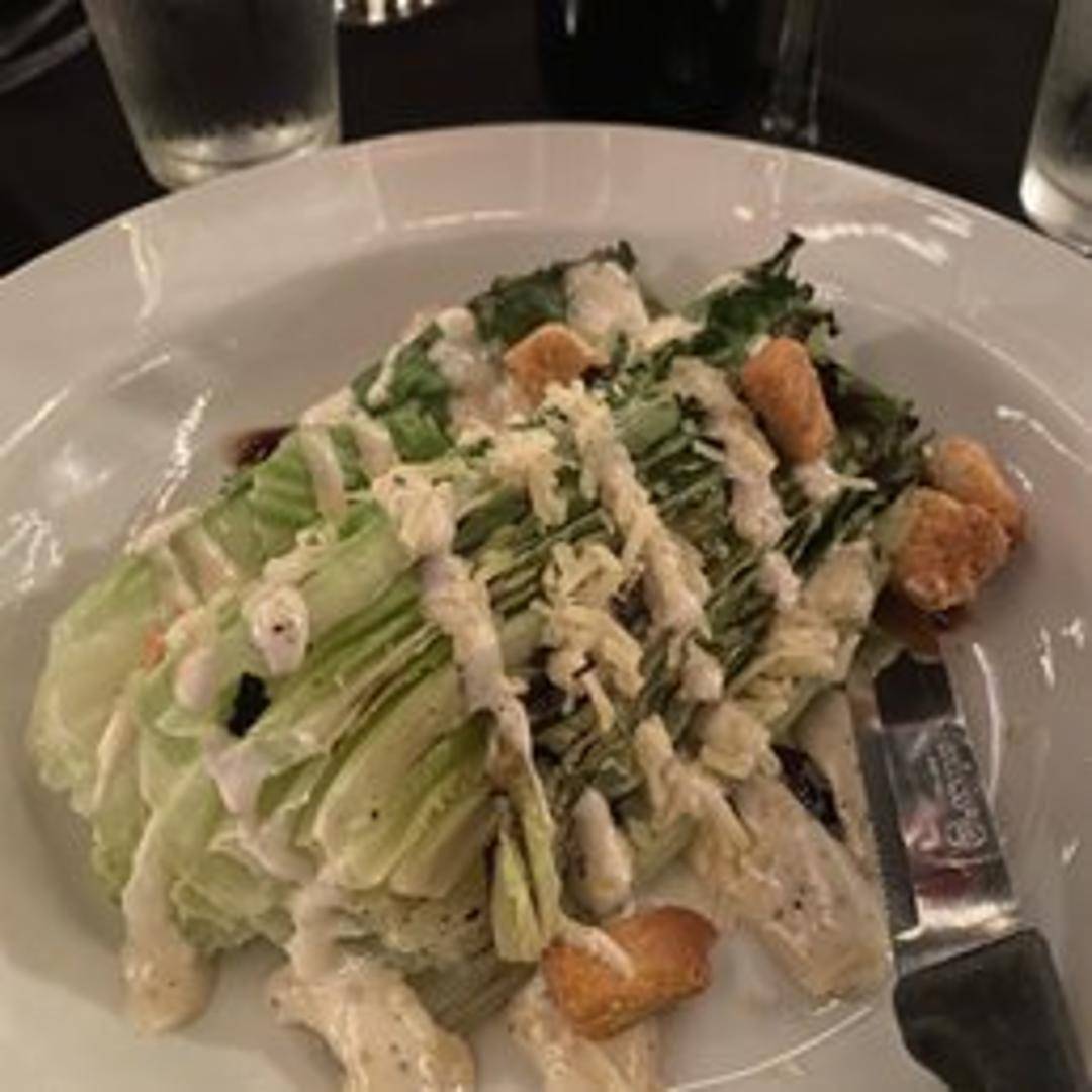 A wedge of crisp iceberg lettuce, grilled to add a smoky char, drizzled with creamy Caesar dressing and topped with parmesan cheese and croutons.