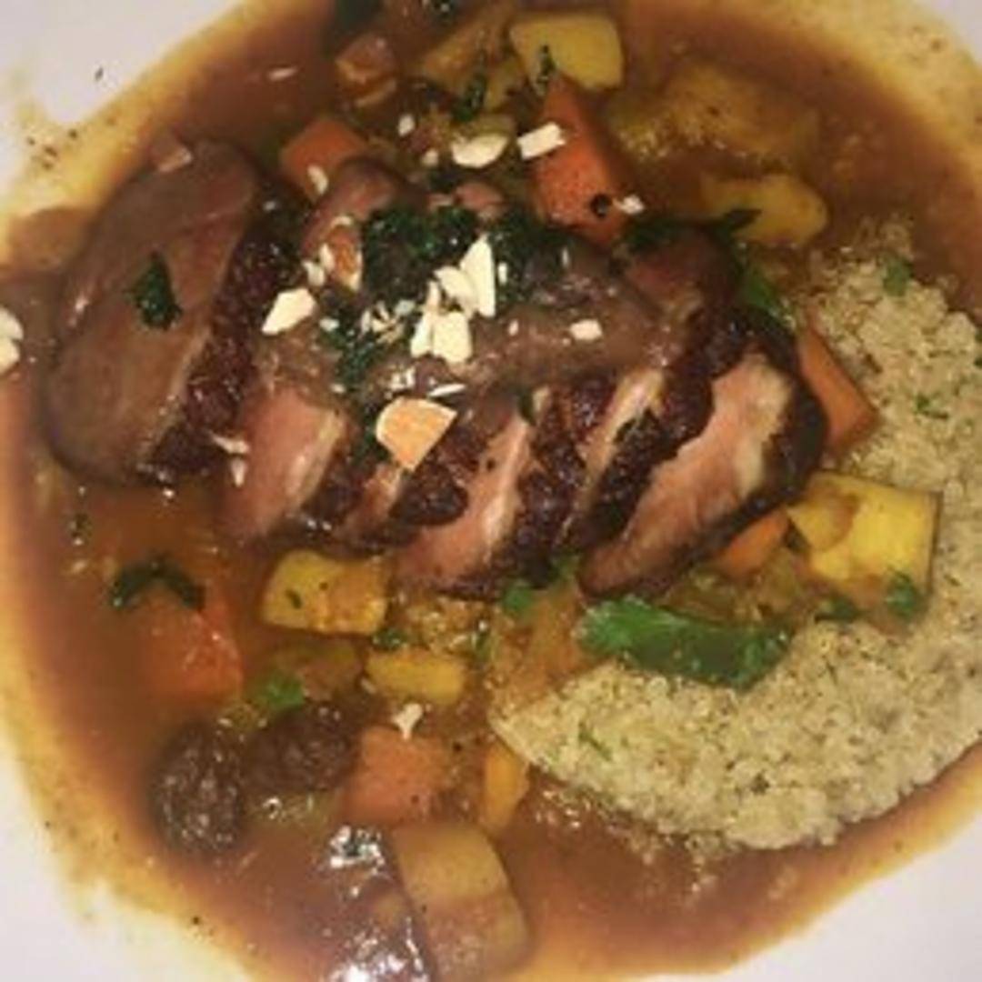Expertly seared to a perfect medium-rare, our Moulard Duck Breast boasts a crispy, golden skin and tender, succulent flesh. It is elegantly presented with a luscious cherry gastrique, complementing the duck's rich flavor with a hint of sweetness and tartness, and accompanied by seasonal market vegetables.