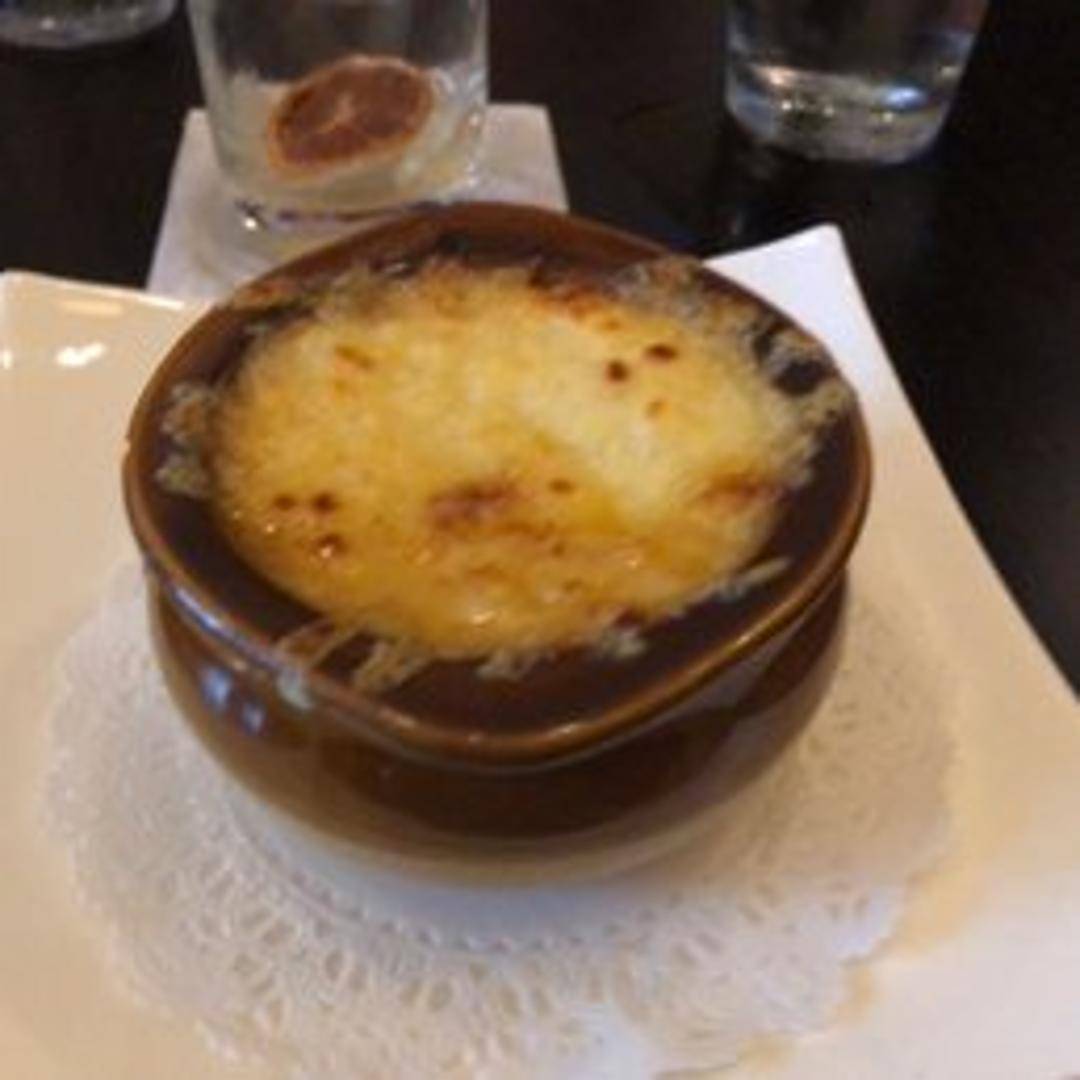 A classic and comforting French staple, featuring a rich, deeply flavored beef broth brimming with sweet, caramelized onions. Topped with a crusty baguette slice and a generous blanket of melted, bubbly Gruyère cheese, then perfectly gratinated.