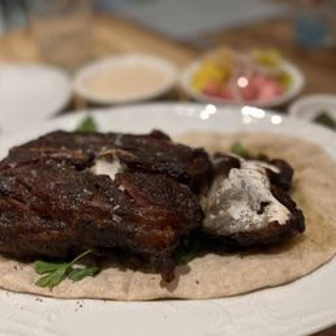 Tender and flavorful slow-roasted lamb neck, thinly sliced and served shawarma-style, typically with accompaniments like tahini, pickles, and laffa bread.
