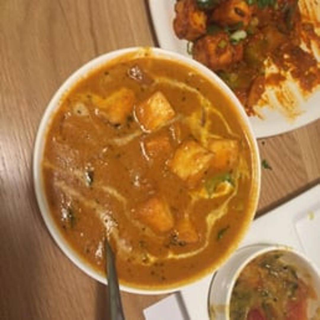 Cubes of Indian cheese (paneer) marinated in spices and yogurt, then grilled and simmered in a creamy tomato-based sauce with aromatic spices.