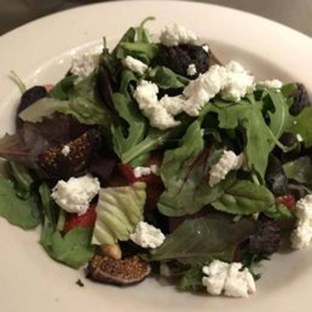 A refreshing salad featuring a mix of seasonal fresh berries and sliced figs, tossed with a light vinaigrette dressing. May contain nuts or seeds.