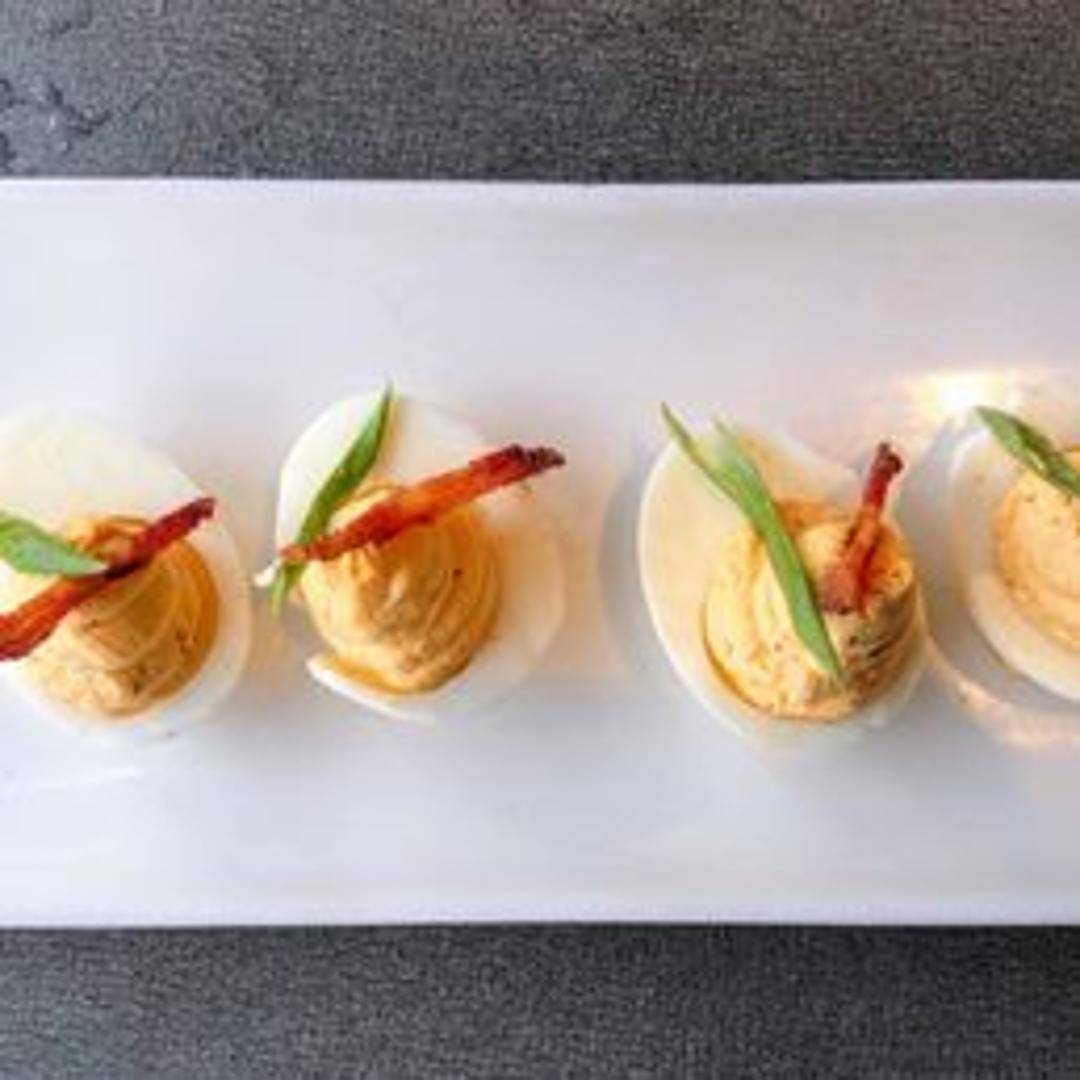Classic deviled eggs with a sweet and savory twist, featuring crispy bacon and a hint of maple syrup. Garnished with paprika and chives.