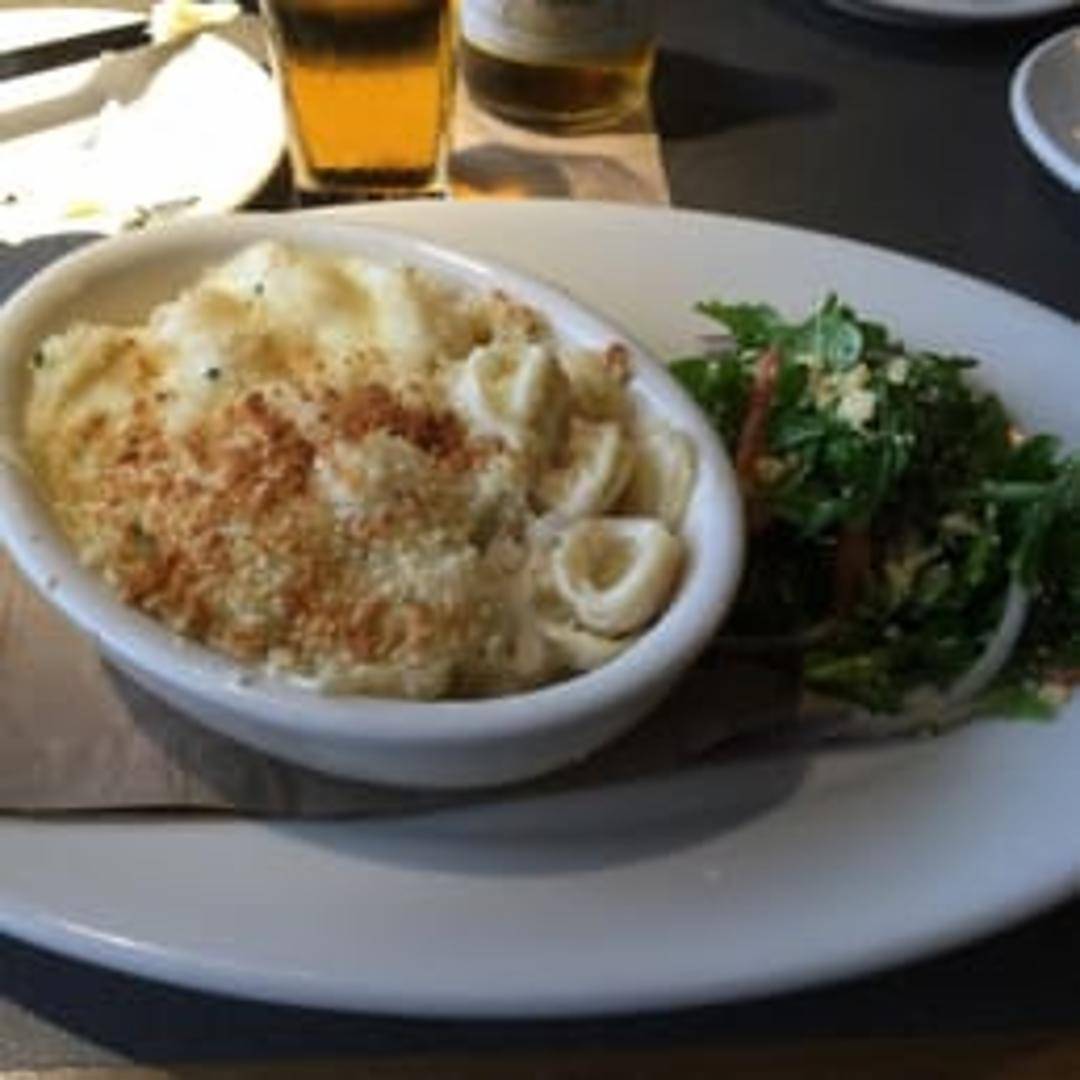 A creamy and decadent macaroni and cheese featuring lump crab meat, topped with a golden-brown breadcrumb crust. Served hot and ready to enjoy.