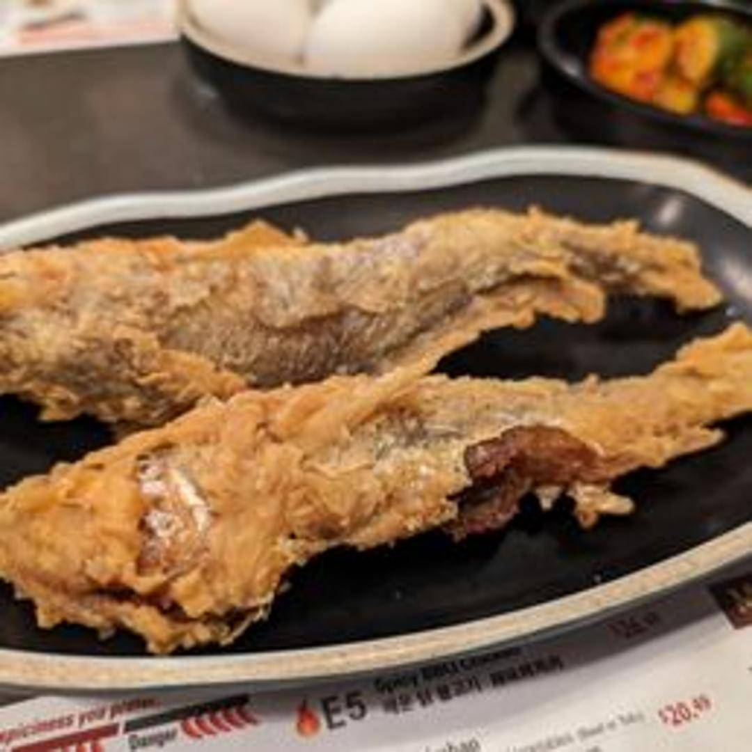 A crispy fried fish, often a mild white fish such as mackerel or croaker. Served with a dipping sauce and can be served with rice and banchan.