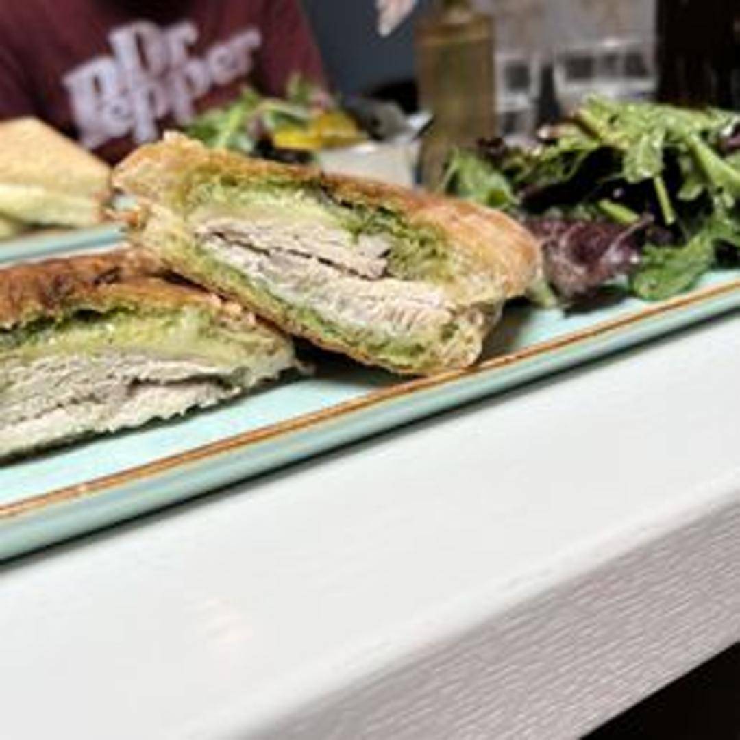 Grilled chicken breast, marinated in herbs and spices, layered with roasted red peppers, provolone cheese, and pesto aioli. Pressed in a ciabatta roll until golden brown and the cheese is melted and gooey. Served warm.