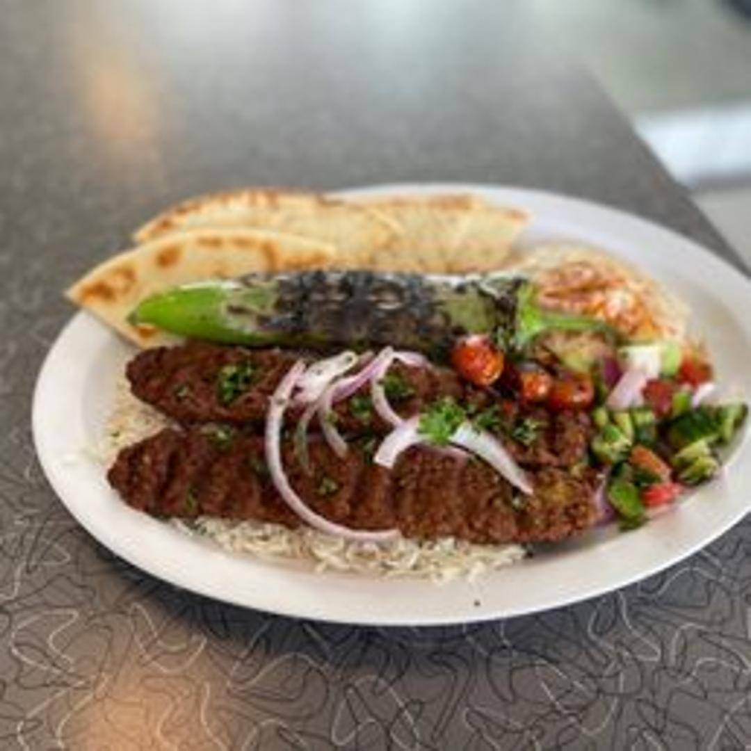 Grilled plant-based kabobs, marinated in a savory blend of herbs and spices. Accompanied by fragrant basmati rice, a refreshing chopped salad (tomatoes, cucumbers, parsley, and onions), flavorful hummus, and warm pita bread.