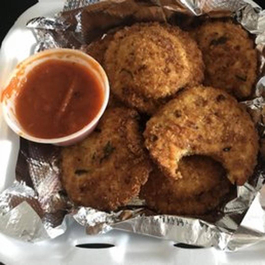 Lightly fried cheese ravioli served with marinara sauce for dipping.