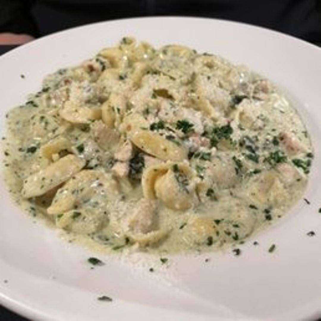 Tender cheese-filled tortellini tossed in a vibrant basil pesto sauce with grilled chicken. Garnished with shaved Parmesan cheese and toasted pine nuts.