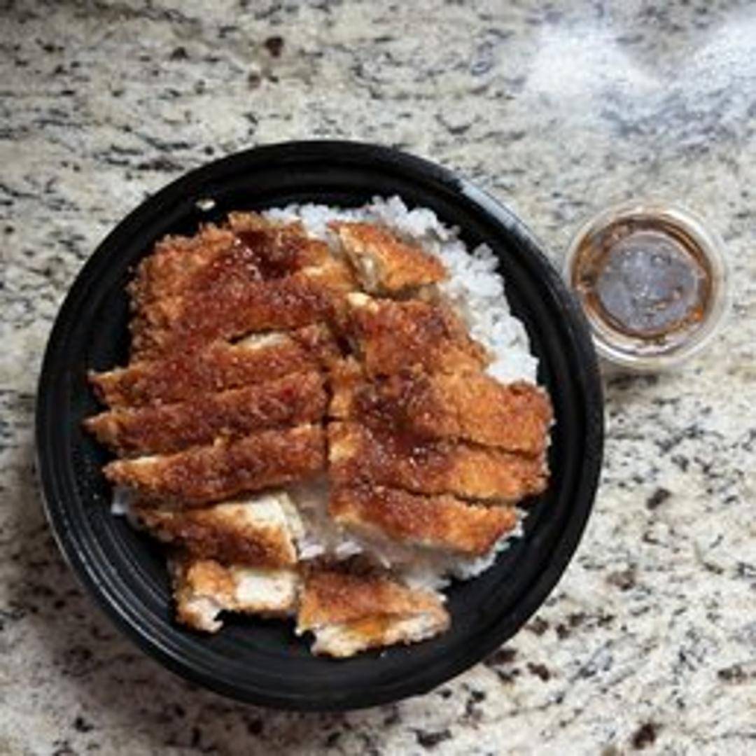 A bowl filled with your choice of rice, topped with grilled chicken, and your selection of fresh toppings and flavorful sauces.