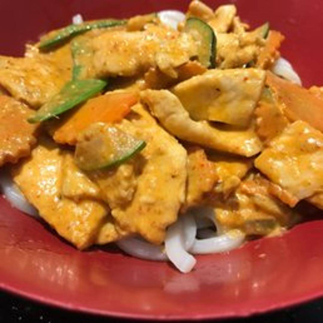 A spicy and flavorful curry cooked in coconut milk with bamboo shoots, bell peppers, basil, and your choice of protein. Served with steamed rice.