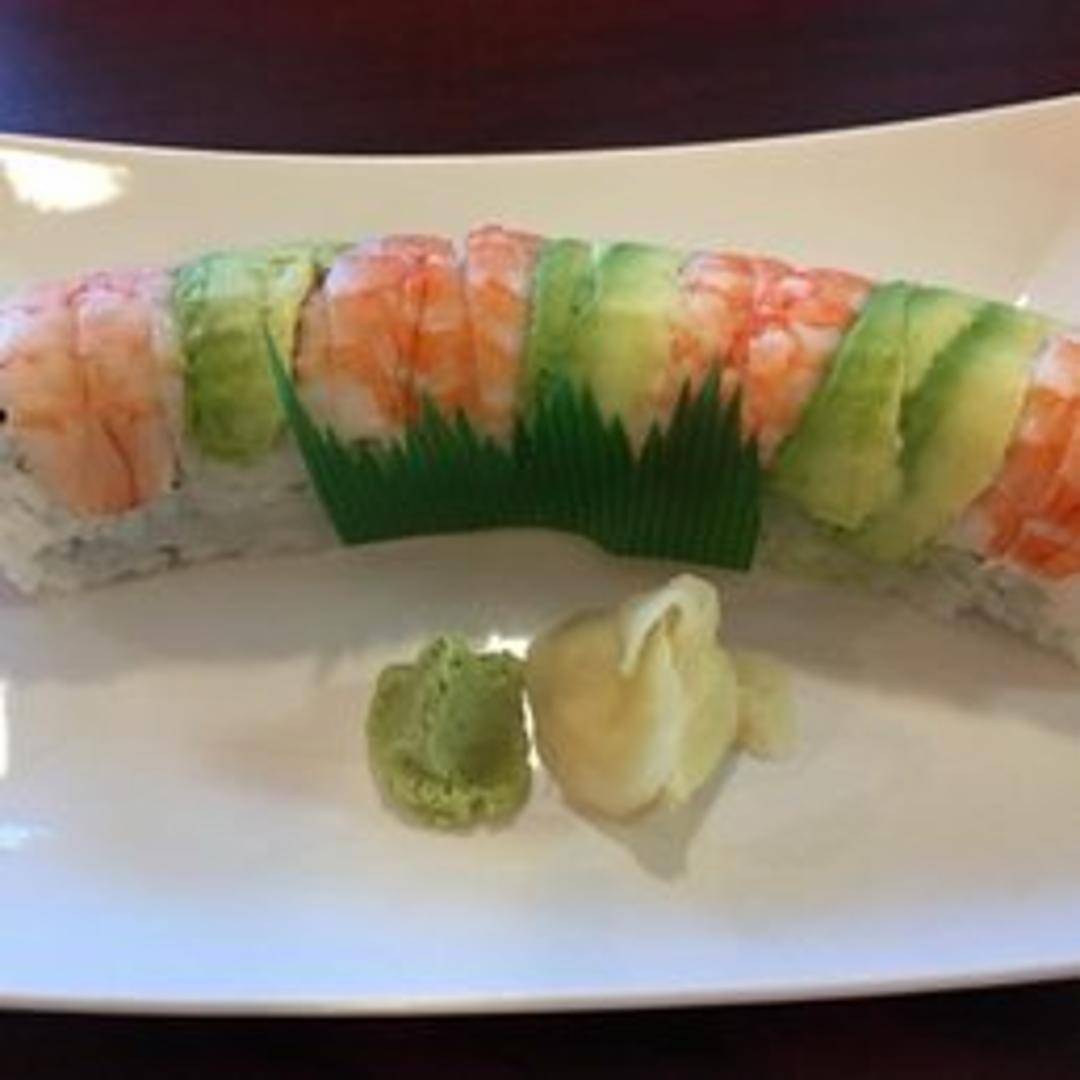 An inside-out sushi roll featuring cucumber and crab meat, topped with avocado slices and eel sauce.
