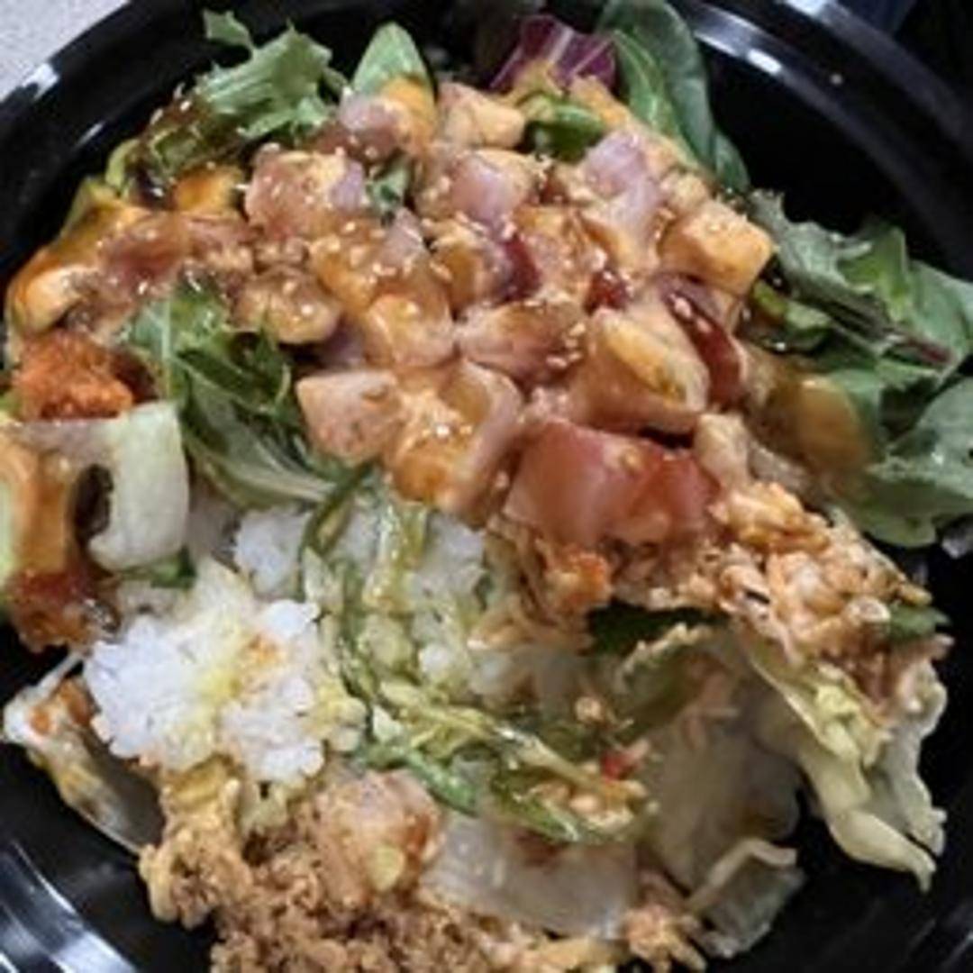 A rice bowl topped with fresh tuna, avocado, seaweed salad, edamame, and sesame seeds. Finished with a drizzle of poke sauce.
