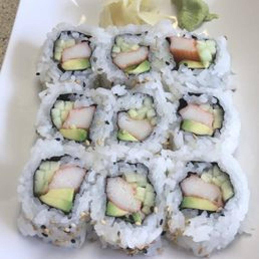 A classic inside-out sushi roll filled with avocado, cucumber, and imitation crab meat, sprinkled with sesame seeds.