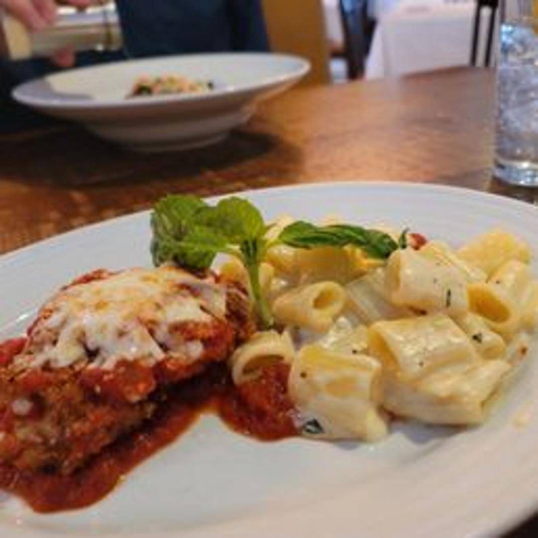 Breaded chicken breast topped with marinara sauce and melted mozzarella cheese, served with your choice of pasta or side.