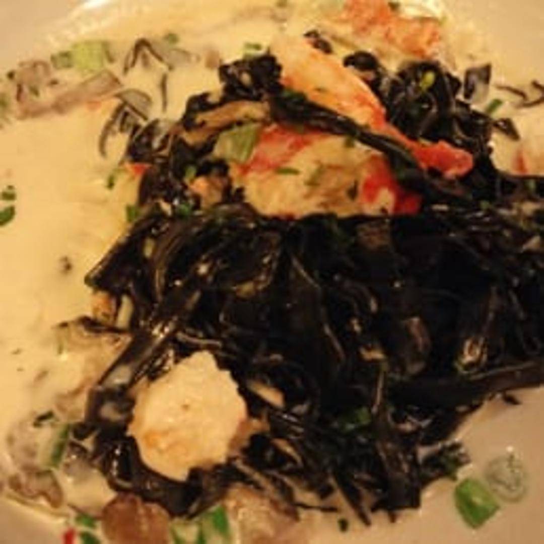 Squid ink fettuccine pasta tossed in a creamy sauce with shrimp, scallops, crab meat, garlic, and a touch of spice.