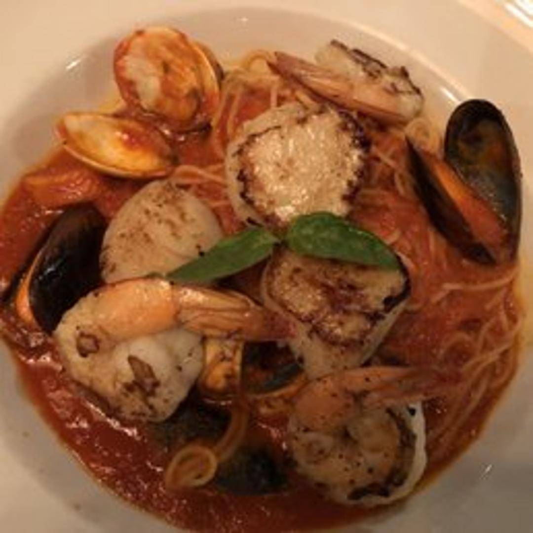 Angel hair pasta tossed with shrimp, scallops, mussels, clams, and garlic in a light tomato sauce.