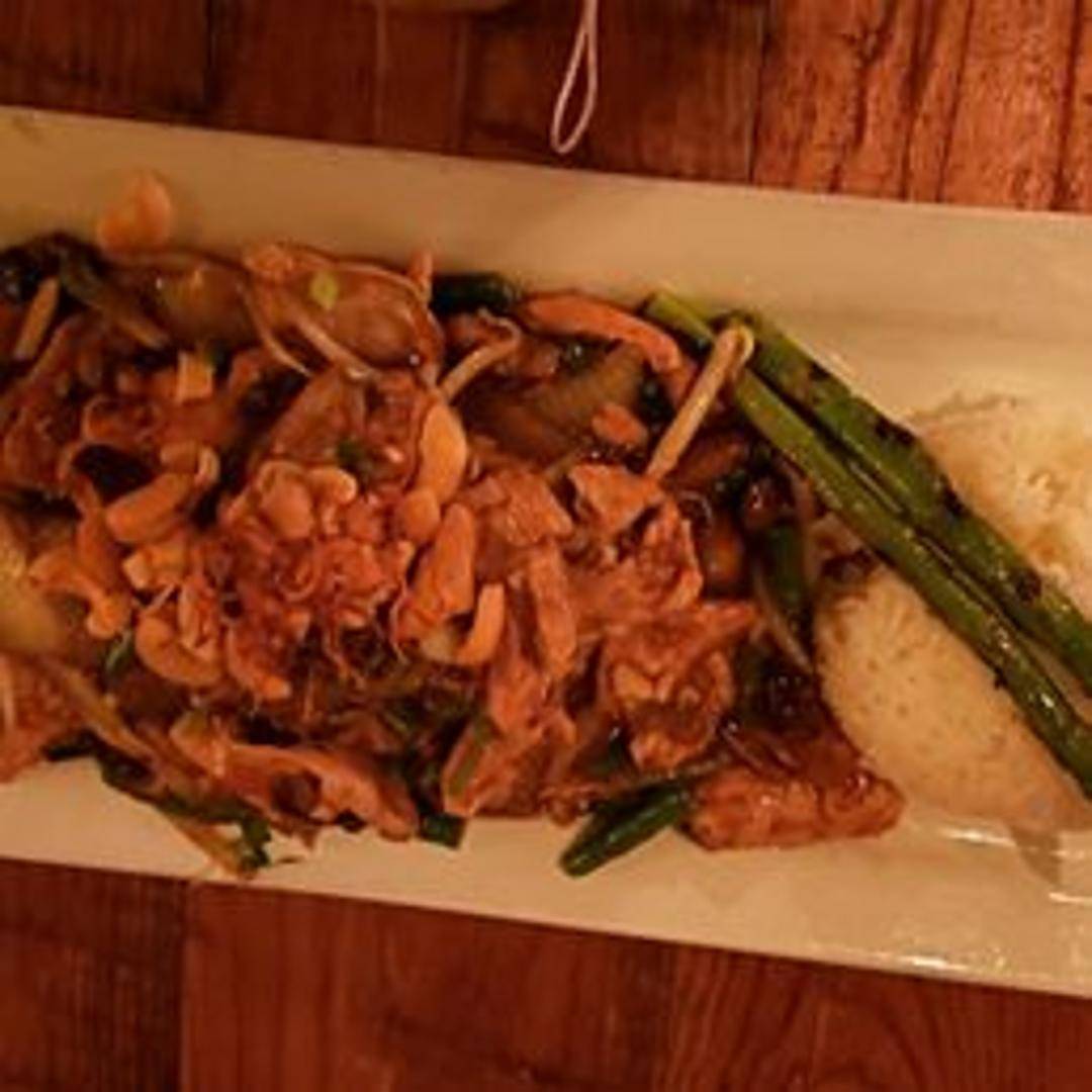 Tender pieces of marinated chicken, stir-fried to perfection with an abundance of crunchy cashews and fragrant fresh ginger. This vibrant dish is complemented by a medley of crisp vegetables and coated in a rich, savory sauce that balances umami notes with a subtle hint of sweetness and aromatic spice. A comforting yet sophisticated take on a classic, highlighting the fresh, bright flavors characteristic of Laotian-inspired cuisine.