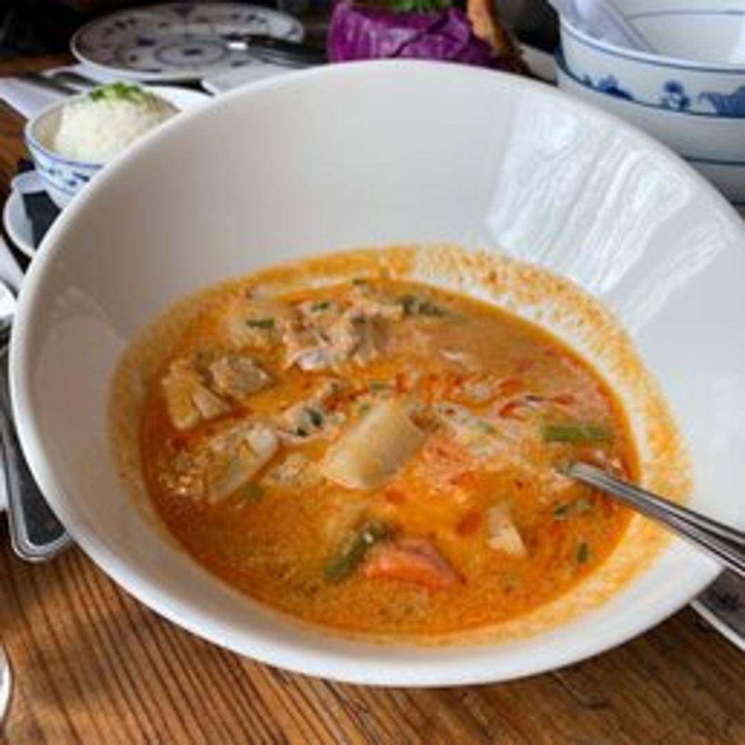 A rich and aromatic Chicken Curry, featuring tender pieces of chicken simmered in a luscious, fragrant coconut milk-based broth. Infused with a blend of traditional Laotian spices and herbs, this warming dish offers a comforting and deeply flavorful experience.