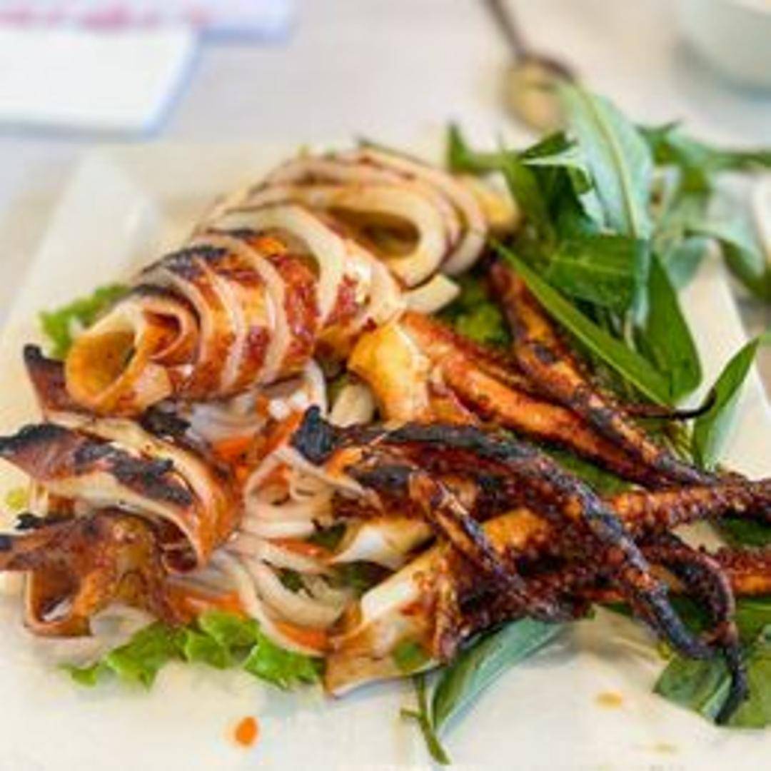 Experience the tender and savory 'Grilled Squid,' a popular Vietnamese delicacy expertly prepared with a delicate char. Fresh squid is seasoned with traditional spices, grilled to perfection to achieve a delightful texture and smoky aroma, often served with a tangy, spicy dipping sauce that perfectly complements its natural sweetness.