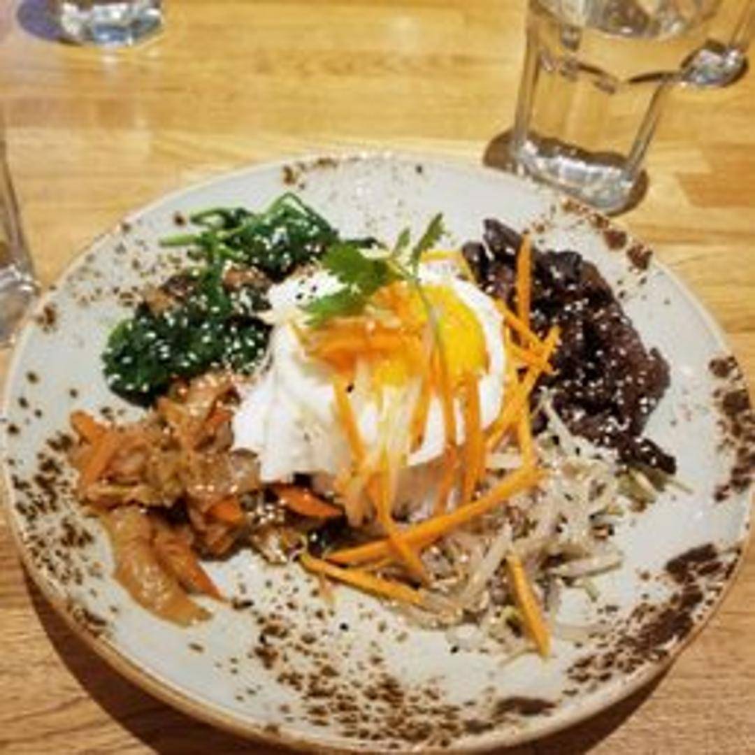A Korean mixed rice bowl with a colorful array of sautéed and seasoned vegetables, a protein of your choice (beef, chicken, tofu), a fried egg, and gochujang (Korean chili paste). Served over a bed of warm rice and designed to be mixed together for a flavorful and balanced meal.