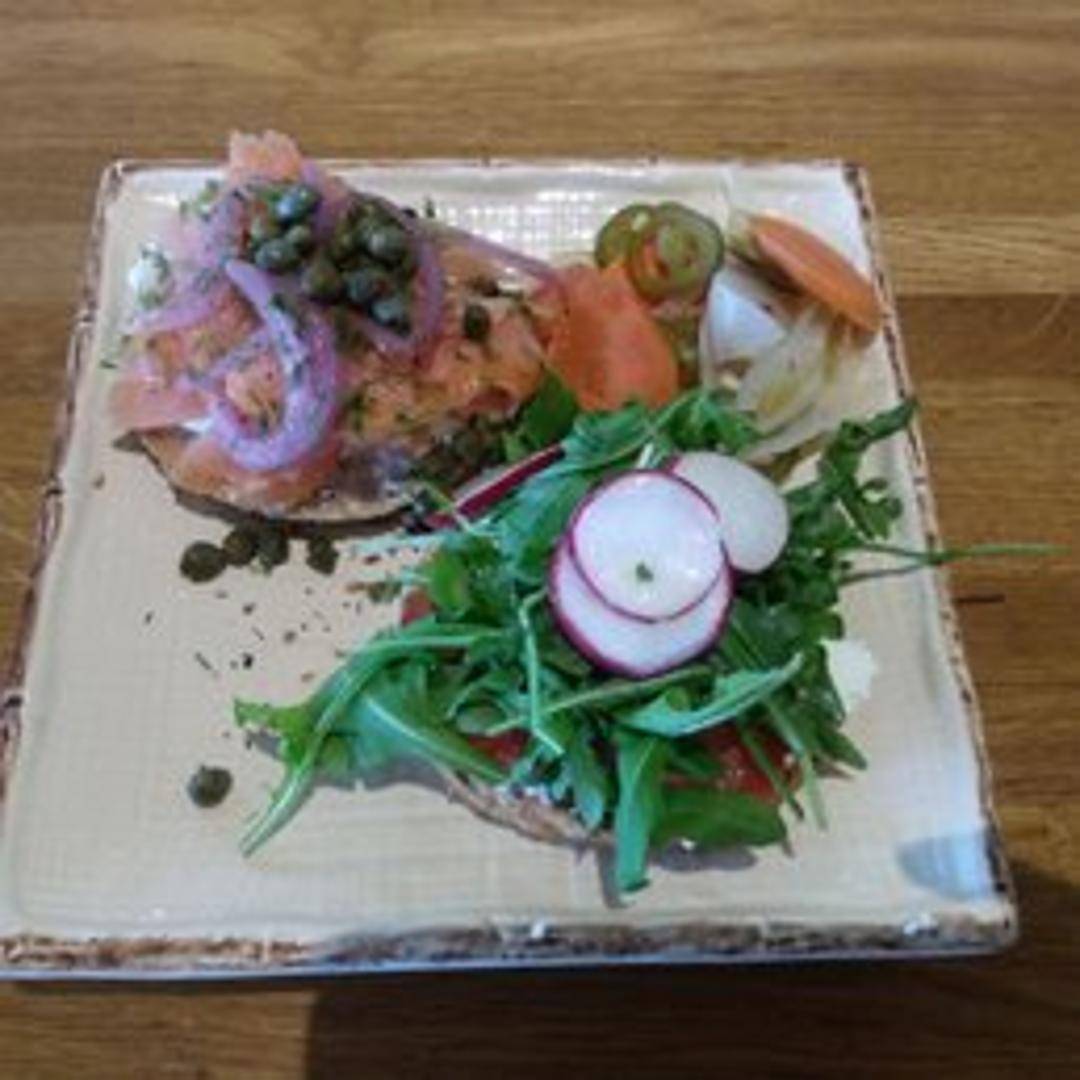 A toasted bagel topped with cream cheese, thinly sliced smoked salmon, capers, red onion, and fresh dill. A classic combination offering a balance of savory, creamy, and smoky flavors.