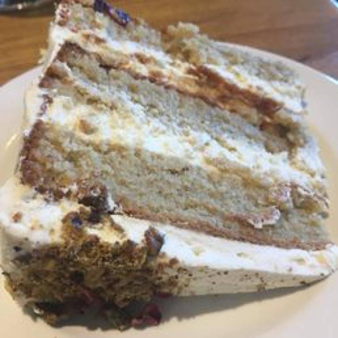 A fragrant and delicate cake infused with rosewater, cardamom, and pistachios. Topped with a light dusting of powdered sugar and edible rose petals, offering a subtly sweet and aromatic experience.