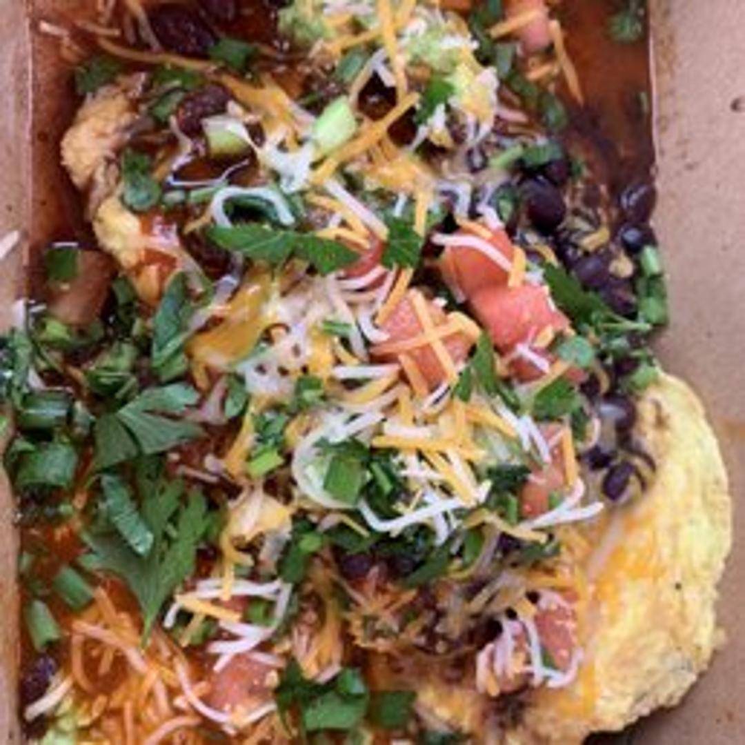 A thick, hand-made corn tortilla (sope) topped with slow-cooked, tender pork, refried beans, shredded lettuce, crumbled queso fresco, and a generous drizzle of house-made ranchero sauce. A satisfying and flavorful dish with a blend of textures and authentic Mexican flavors.